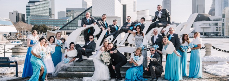 Kim & Jerry decided to do a first look, and for a photographer, this made me so happy!! By doing a first look, we were then able to get all of the bridal party portraits done before the ceremony. So, after the ceremony and family photos, it was party time at the reception! Kim was a smart planner, and got a permit for us to take photos in a gorgeous historic theater in downtown Cleveland, called Connor Palace in Playhouse Square, and it did not disappoint. I even got the bride and groom on stage! After the theater, we snapped a few in front of the Cleveland Chandelier, always wanted to do that. From there, we made our way to the Cleveland sign behind the Rock and Roll Hall of Fame.